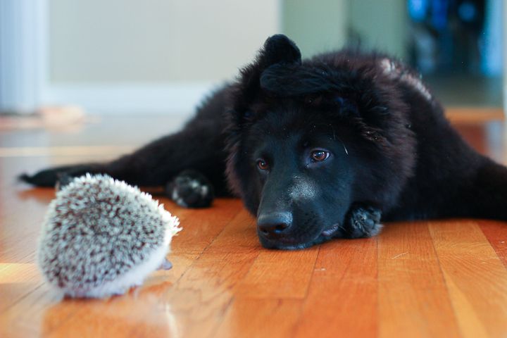 We've been working kind of hard to get Jasper (pup) and Pendleton (hedgehog) to exist in the same room together without a)Pendleton having a heart attack or b)Jasper ending up with a mouthful of quills.