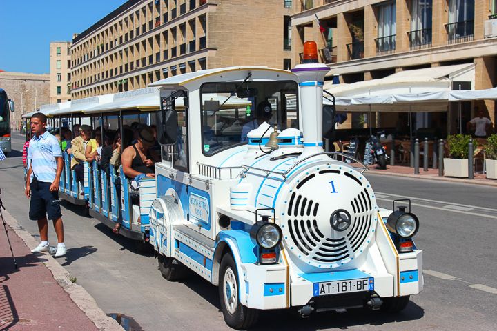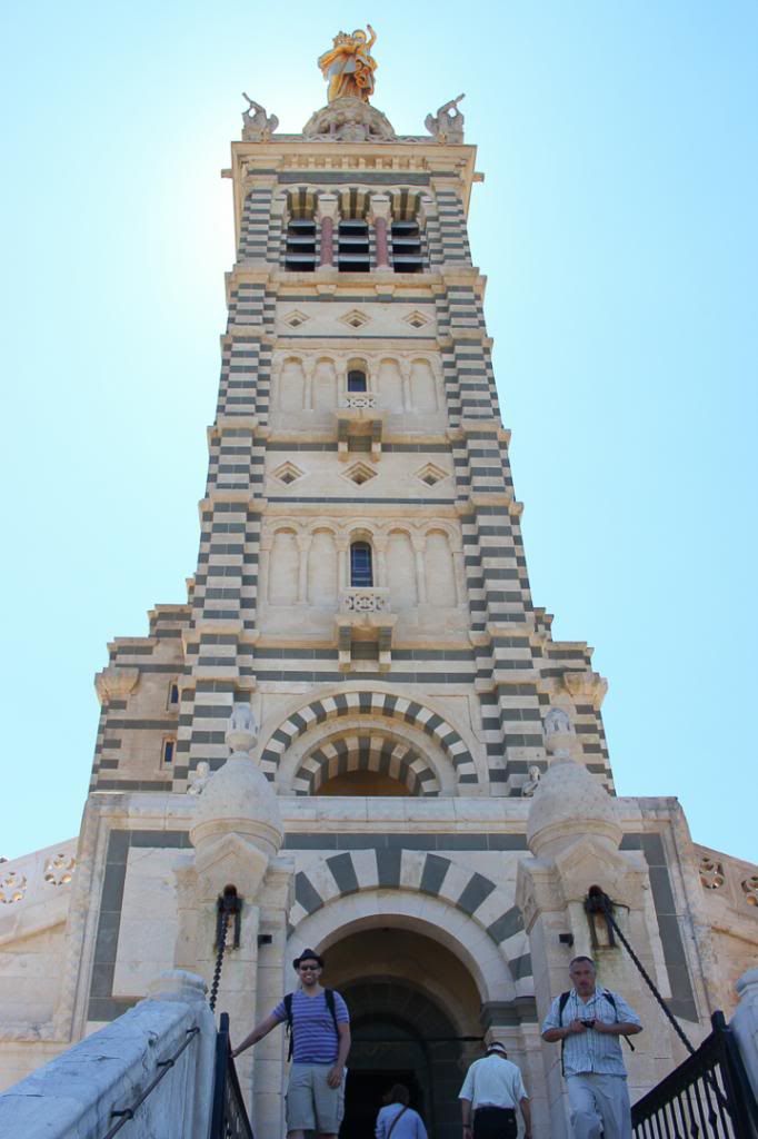 We wandered around the town for a little bit and then decided that the one thing we had to do with our limited hours was take a cheesy little train/car (petit train) up to the very tippy top of the tallest point in Marseilles to see Notre-Dame de la Garde which is a basilica that was built on top of the remains of an ancient fort. You can see the church from basically anywhere in the city. It kind of taunts you to come visit.